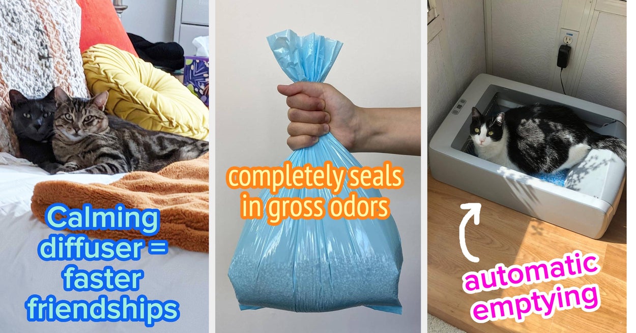 We hope you love our recommendations! While every product is independently chosen by our editors, BuzzFeed and our publishing partners may collect a share of sales or other compensation from the links on this page. You can read more about how our affiliate partnerships work in our Editorial Standards & Ethics Guide. This self-emptying litter box is actually about to become your new favorite thing. The hands-free cleaning cycle runs 20 minutes after your cat leaves the litter box, moving their waste to a leak-proof, odor-controlled, and disposable tray underneath. Also grab a bag of scoop-free crystal litter and tray refills, too. Promising reviews: "This litter box is a must for any busy family that struggles to keep up with the daily maintenance of having a cat and a litter box! It works well, and my cat is so happy always having a clean litter box." —Kelsey Jeffries "I rarely write product reviews but this litter box actually made a huge difference for my house! I have had a cat for about 10 years who decides to do the number 2 about two feet outside the litter box. He has ALWAYS done this, no matter what type of litter or box. I even asked my vet about it, and his response was, 'Some cats are just jerks.' 😂 Then I got this litter box. For the first time EVER, he does ALL of his business in the box! And there is no odor at all!! I love it so much I have two. Would highly recommend!!" —Emily Stokes Reviewers say it works for both small and bigger cats alike! One reviewer's tip: Make sure the side without the grooved lid is facing a wall so that cats can't jump out that way (the grooved side is what prevents litter tracking). Note that if you have a senior cat with limited mobility, you'd want to provide a litter box with low, easy access for that cat. Promising review: "We have three cats and have to manage a silly amount of cat politics. We've learned that having a higher number of litter boxes, and spread to different locations, cuts way down on bullying and helps cats to feel safe, [as they are] instinctively territorial about where they put their scent and feel vulnerable when they're 'in the act'. This cat box helps to be able to have boxes in rooms of the house where a cat box would feel garish, not to mention the litter mess. It took a little while for my cats to try it out but they're using it now and don't get to kick the gravel out everywhere (I swear they do it on purpose)." —Dism Get it from Amazon for $33.99+ (available in four colors). BuzzFeed Shopping editor Jenae Sitzes and her cats approve of this: "Both of my cats took to this fountain immediately — I do feel like they drink *way* more water with it around, and I love not having to stress about refilling their water bowl every single day. I did take the flower waterfall off of mine (as shown in the gif above); you may find your cat prefers that. It's super quiet with only the lightest trickling sound (which is honestly kind of relaxing), and it gets louder when the water gets low inside, signaling to you that it's time to refill. I always do a quick clean with soap and water at that point, too — it takes no more than a few minutes. Just be sure to do a deep clean of the filter every so often, too. It pops open really easily for cleaning!" Get it from Amazon for $27.98+ (available in three colors and an even larger-capacity model). Jenae says, "I've owned these microchip pet feeders from Sure Petcare for a few years now, and while it was a pricey investment, I consider them worth every single penny. They alleviated a ton of stress when I owned a cat (who has since passed on) who was always wanting to gobble down his brother's meals and had a tendency to be overweight in his younger years. Separating them for meals just wasn't working — they would whine at the door and simply not eat enough unless they could eat side by side and have free access to food throughout the day — but I also couldn't be sure that my younger cat was eating enough with his brother gobbling up part of his meals, too. When my vet started throwing around the word "diabetes" as a very real concern if Sneaky didn't start sticking to a controlled diet every day, I knew I needed to finally cough up the money for microchip feeders — I mean, it'd be a drop in the bucket compared to the long-term cost of cat insulin. "The setup was ridiculously fast, the open-close function works beautifully, and my cats learned how to use these almost immediately. Finally, Sneaky could *only* eat what was in his feeder, which allowed me to control his calorie intake and see exactly how much food he's eating daily — and I could be sure that my other cat was getting *enough* food, too. This is also a fantastic solution if you have cats on different diets due to health reasons, and if one of them starts eating way less for some reason, you'll know immediately and be able to report that to your vet. I also love that the feeder comes with both split and regular bowls — I used the split bowls to serve my cats both dry food and wet food at once! "BTW, I have the basic microchip feeder (because it was the only option in stock at the time), but there's also a Wi-Fi-enabled option that connects to the Sure Petcare app for monitoring eating habits, weighing food portions, and more." Get it from Amazon for $199 (feeder bowls available in four colors). Promising review: "This is an excellent product. I bought this to replace my previous one that I accidentally broke. The Genie keeps the bathroom litter box odor-free. I have three cats and one litter box and even with three, I only dump the bags every THREE WEEKS (or so) so it saves me having to make several trips to the outdoor garbage bins every single day. The only thing I don't like is that I can't find cheaper inserts for it any longer so I have to purchase the more expensive Genie ones but that's really my only complaint." —Coryelle Get it from Amazon for $25.99 (includes about 2.5 months worth of refill