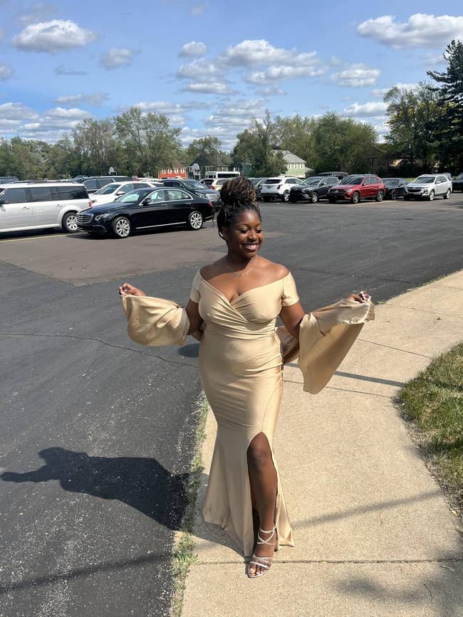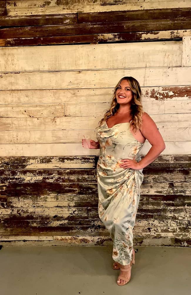 Promising review: "I was worried about ordering this dress because some of the reviews stated that the sizing is weird. It's PERFECT! I wore it to my brother's wedding and got so many compliments. The straps being adjustable helped to make it a perfect fit. This is my new go-to dress for weddings and other events. For those asking about what bra to wear, I just wore the silicone petal covers, and they worked great with the dress." —Kelsey