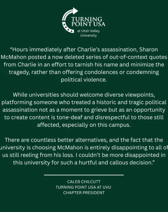 Caleb Chilcutt, President of Turning Point USA at UVU, issued a statement opposing the university’s decision.