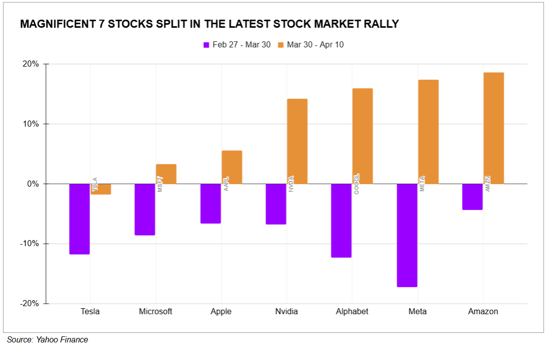 But under the hood, the rebound has divided the Mag 7 into two camps. Amazon (AMZN), Nvidia (NVDA), Alphabet (GOOGL), and Meta (META) have surged off the late-March lows, while Tesla (TSLA), Microsoft (MSFT), and Apple (AAPL) have trailed.