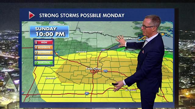 FOX 9 Meteorologist Ian Leonard says strong storms are possible late Monday afternoon and into the evening, an area that includes the Twin Cities metro. On the back side of that, we stay generally unsettled for most of the week.