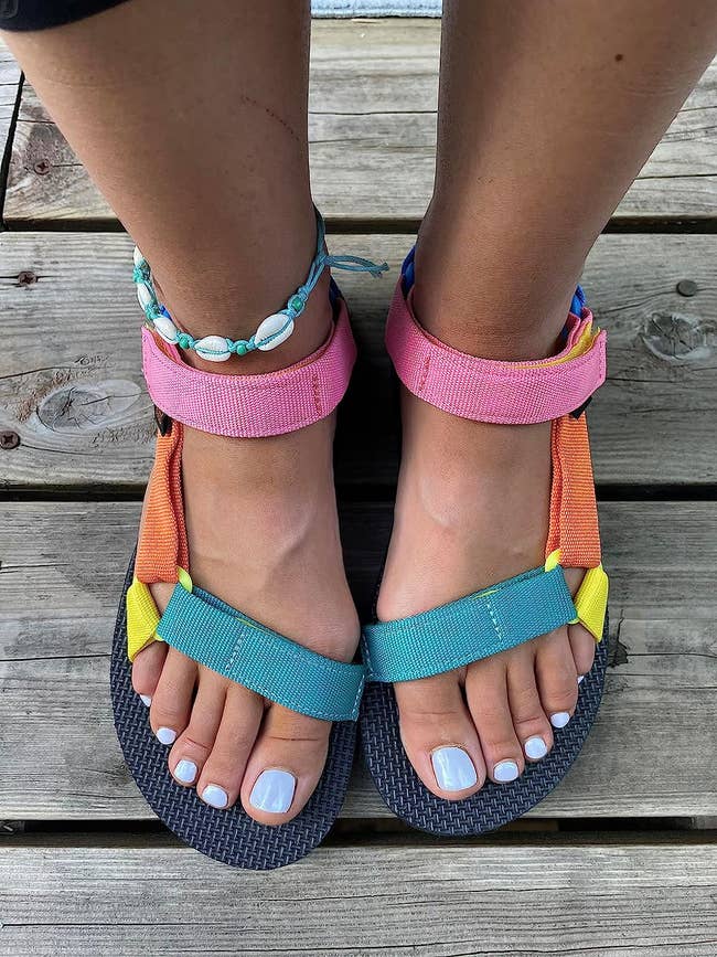 Promising review: "I have three pairs of these now! They feel great. The straps are comfy. When I bought my first pair I worried the straps would make it difficult to get the shoes on and that they might be uncomfortable/cause chafing. I was pleasantly surprised at how comfortable they really are though!!! I alternate the colors and wear them nearly daily now — perfect summer shoes. We went on a beach vacation...We walked for hours at a time and I never once got a blister or felt any discomfort. I didn't have any issues with my feet sliding around uncomfortably when wet — whether from sweat or when it rained. They were great for walking on the beach, too!! These are seriously the best summer shoe!" —Stark