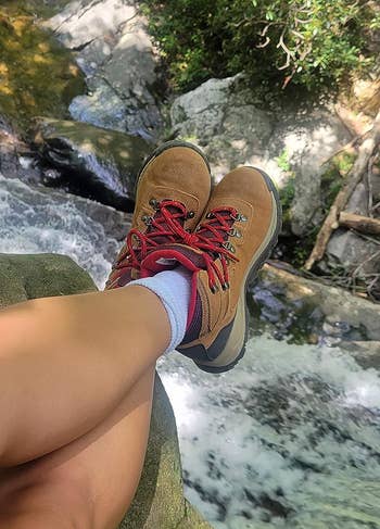 I also found that they held up well even on my first hike — though I did admittedly still have some soreness around my heel area, this was after a hard, 7+ mile hike with lots of rocks and climbing, so I don't blame the shoes. They felt comfortable right out of the box and super supportive when I was navigating rocks and rough terrain. And though I only stepped in water a couple of times briefly, my socks stayed dry too. I got the brown color with red laces as pictured above, and they're even cuter in person, which is just another plus."