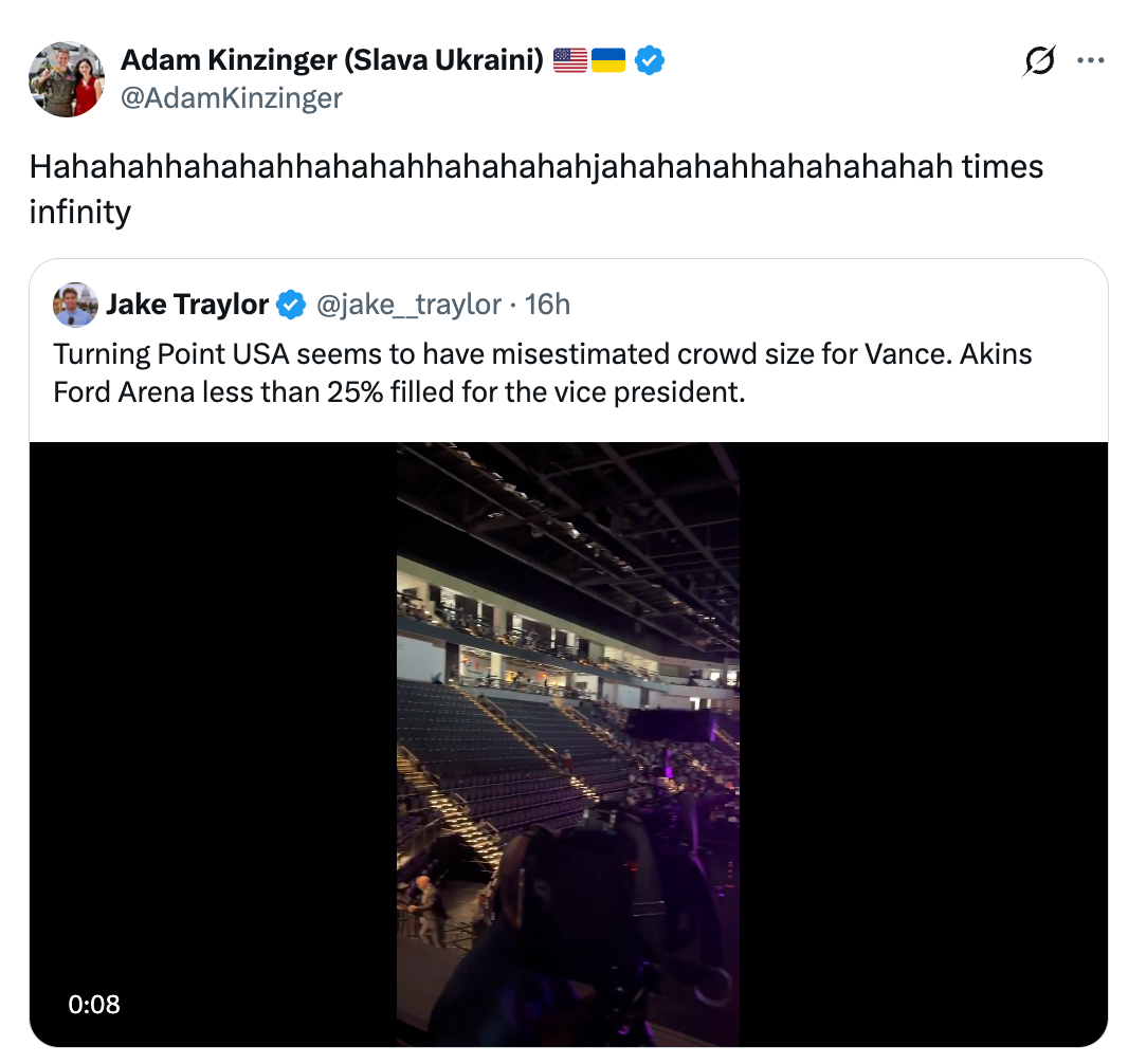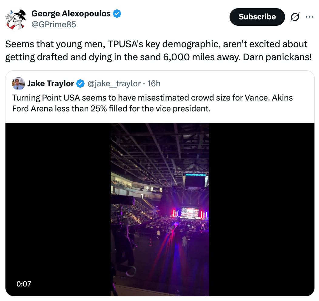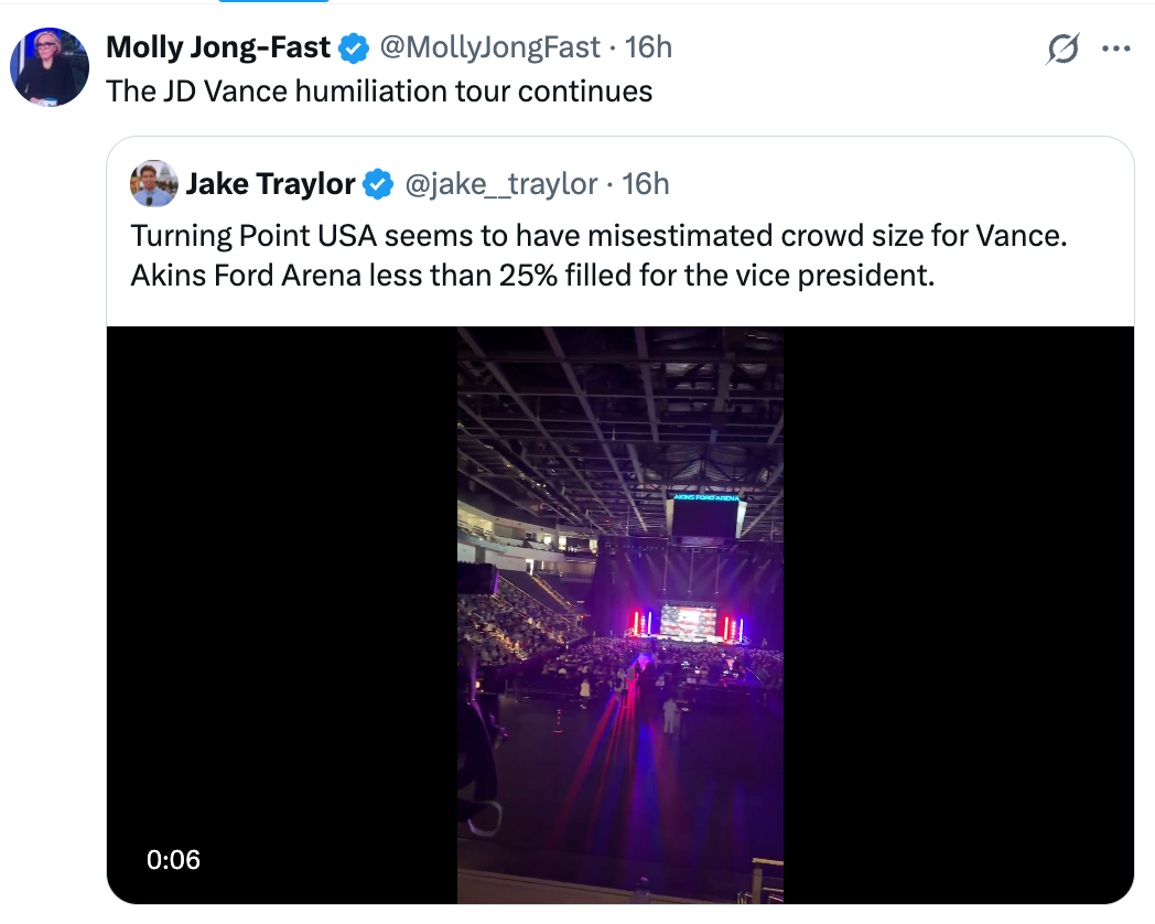 Turning Point USA seems to have misestimated crowd size for Vance. Akins Ford Arena less than 25% filled for the vice president. pic.twitter.com/K2SnkmuATh