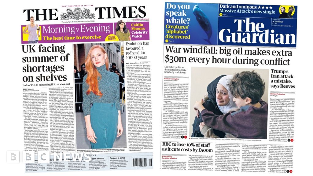 The Times reports that, during a rehearsal codenamed "Exercise Turnstone", government officials found that the UK farming and hospitality sectors would be hit "earliest and hardest" by any shortage of carbon dioxide caused by the continued closure of the Strait of Hormuz, and other problems with gas production. The paper says CO₂ is used in slaughtering nearly all pigs and more than two-thirds of chickens and the farming sector is not thought to have much by way of surplus supplies. A senior government source told the BBC that the planning was for a worst case scenario and not a prediction of what would happen. The planning did not suggest there would be a lack of critical supplies of food, the source said. The Daily Telegraph leads on a forecast by the International Monetary Fund, that taxes in the UK are set to rise the fastest, out of any of the G7 nations. It says the tax burden as a proportion of GDP will be more than 40%, a "peacetime high" as the paper puts it, at the start of the next decade. The Financial Times reports that Iran has acquired a Chinese-built spy satellite which it is allegedly using to monitor US bases in the Middle East. The paper says that with Tehran targeting its Gulf neighbours, who sell oil to China, the matter is "sensitive". China tells the Financial Times the report is untrue. The Guardian carries an analysis of oil and gas companies' profits reporting that the world's top 100 firms had a "war windfall" in March, totalling $US23bn (£16.9bn). Hundreds of public bodies are, according to the Daily Mail, yet to update their policies on single-sex spaces, despite the Supreme Court's landmark judgement on biological sex, a year ago. The paper's headline is "Labour's Shameful Betrayal of Women". A government spokesperson says it has always supported the protection of single-sex spaces, based on biological sex. Several of the back pages report that LIV Golf is in jeopardy, with the tour's Saudi backers set to pull their funding. The Daily Telegraph says senior executives have been summoned to an emergency meeting in Manhattan. And the Sun reports that the transport secretary's car had to be towed away after hitting a pothole. Heidi Alexander tells the paper the car blew two tyres thanks to a "crater worthy of the moon" on a road near Burford in Oxfordshire. She acknowledges the resulting expense and inconvenience adding that it was "the experience of far too many people in the country at the moment". Sign up for our morning newsletter and get BBC News in your inbox.