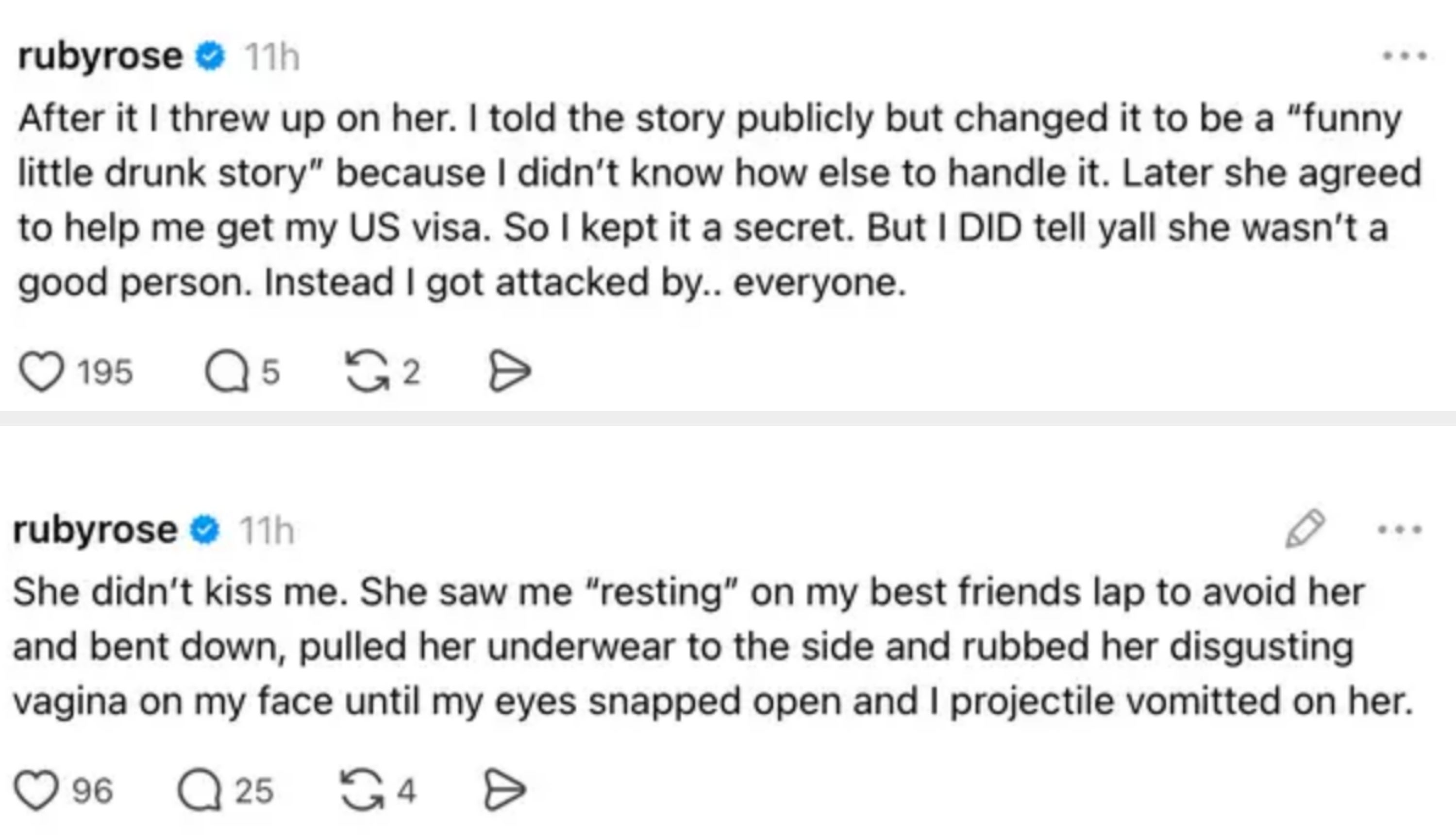 It comes after Katy’s representative vehemently denied Ruby’s claims, accusing her of spreading “reckless lies.” As a Celebrity Reporter, I cover everything from fashion and award shows to TV, film, and cultural conversations. This post discusses allegations of sexual assault. “I was only in my early 20s. I’m now 40. It has taken almost 2 decades to say this publicly. Though I am so grateful to have made it long enough to find my voice, it just shows how much of an impact trauma and sexual assault takes. Thank you for seeing me,” she wrote in a separate post. “Ms. Rose has a well-documented history of making serious public allegations on social media against various individuals, claims that have repeatedly been denied by those named,” they added. “This is a standard request from the police and in many ways, quite the relief. I can start the healing process now. And temporary move forward. I love you all so much,” she said. If you or someone you know has experienced sexual assault, you can call the National Sexual Assault Hotline at 1-800-656-HOPE (4673), which routes the caller to their nearest sexual assault service provider. You can also search for your local center here.