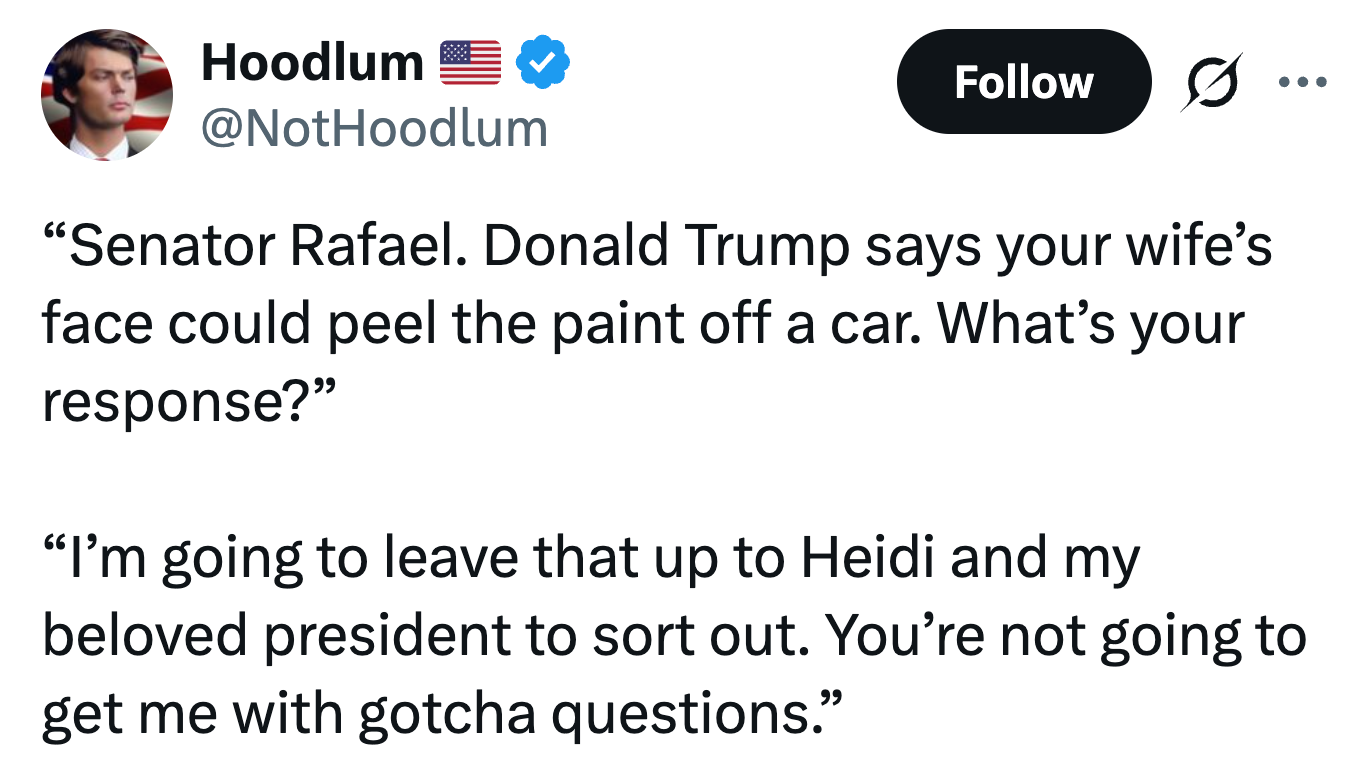 This week in the Cringe Report, we have an update on the top FEMA official who “teleported” to a Waffle House, Pete Hegseth’s favorite “Bible verse,” and so much more. As a Senior Lifestyle editor at BuzzFeed, I cover stories about health, home, politics, and relationships, with a special focus on work and money. Not to mention the DoorDash Grandma incident. Pete Hegseth quotes a fake Bible verse from Pulp Fiction during a Pentagon prayer service:"The path of the downed aviator is beset on all sides by the iniquities of the selfish and the tyranny of evil men. Blessed is he who in the name of camaraderie and duty, shepherd the lost… pic.twitter.com/fBmZ5i09vu Trump voter reacts to Trump's post depicting himself as Jesus:"That's a disgrace. I'm very upset about that. I mean, how egotistical can you possibly be? I'm ashamed that he would actually do that. The man I voted for and trust." pic.twitter.com/NJfkclFyVi Q: Did you post that picture of yourself depicted as Jesus Christ?TRUMP: I did post it and I thought it was me as a doctor and had to do Red Cross. Only the fake news could come up with that one. pic.twitter.com/z5tPuqSvA7 Q: How much longer will American continue to see these high gas prices?TRUMP: Well, they're not very highQ: $4 a gallon stillTRUMP: That's what ABC says, but the stock market is up. Everything is doing really well. pic.twitter.com/yIxHXKqXII Reporter: Dr. Oz said the President argued that diet soda is good for him because it kills grass therefore it must kill cancer cells. Leavitt: As we all know, the president has a very good sense of humor. I have heard him tell this joke before. pic.twitter.com/k02uE6orIH AMERICAN EXCEPTIONALISM 🇺🇸 pic.twitter.com/G0w8JOMRNp Bessent calls the Strait of Hormuz the "Strait of Vermouth" pic.twitter.com/nRxPUDOyT8 Sewell: In a 2024 podcast interview, you suggested that black children on ADHD medication should be re-parented . Have you ever re-parented or parented a black child?RFK JR: I'm not going to answer something that I didn't say. Sewell: You absolutely said it. pic.twitter.com/Gbfppd6PaM Rep. Sanchez to RFK Jr: You're spending taxpayer dollars to drink milk shirtless in a hot tub with Kid Rock, and somehow you think that's a better public health message than informing the public about the importance of vaccines. pic.twitter.com/GcwcEhuq2p Q: Do you believe there should be a public hearing for these Epstein survivors?Trump: The women, the victims or whatever, refused to go under oath pic.twitter.com/TuaxxUZ1M8 Our segment tonight on Gregg Phillips, the top FEMA official in charge of disaster response and his many videos of his claims of supernatural encounters.Teleporting to a Waffle House, a dead girlfriend who lifted his car off the road to avoid a crash. Satan speaking to him… pic.twitter.com/o0HCJBZ44g a very confused Trump: "Look at Justice Ginsburg. She was not exactly a young woman. The election was taken. They had a Democrat who could've appointed a liberal justice. About two minutes after the election, she went out." (Ginsburg died in September 2020, when Trump was… pic.twitter.com/6Hw6bQzlaE