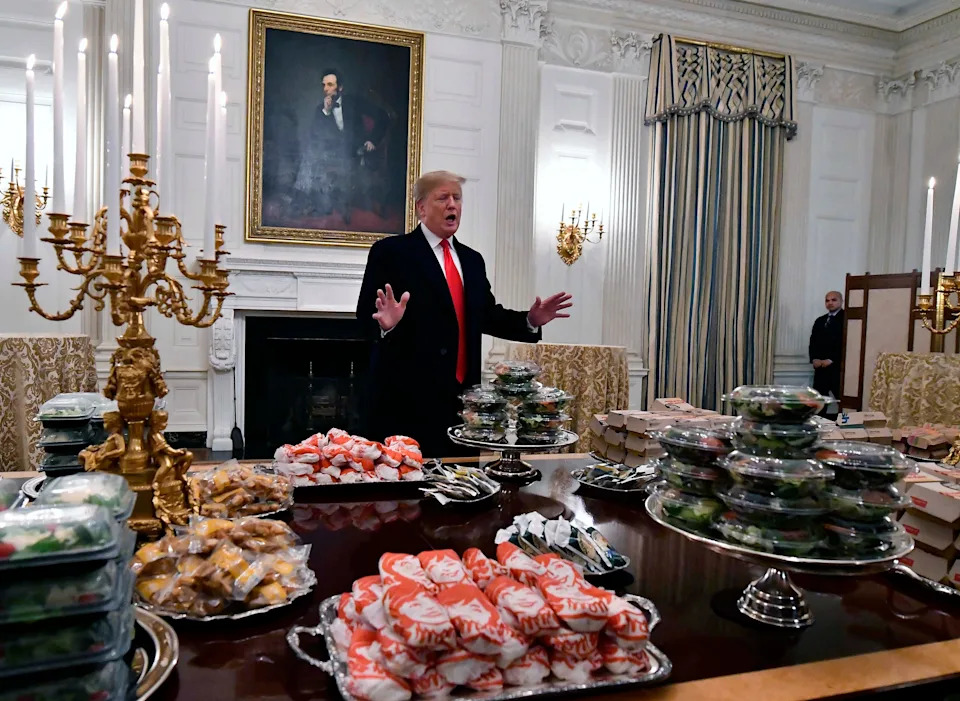 RFK Jr. appeared on the “Katie Miller Podcast” on Jan. 13, 2026. When asked which member of the administration has the healthiest diet and fitness routine, he mentioned Shawn Duffy and Pete Hegseth. When asked who had the most "unhinged" diet, Kennedy answered, "The president,” citing Trump’s love of McDonald’s, candy, and constant Diet Coke. See Trump's love for fast food starting with tables of it for the the college football playoff champion Clemson Tigers in the State Dining Room of the White House on Jan. 14, 2019.
