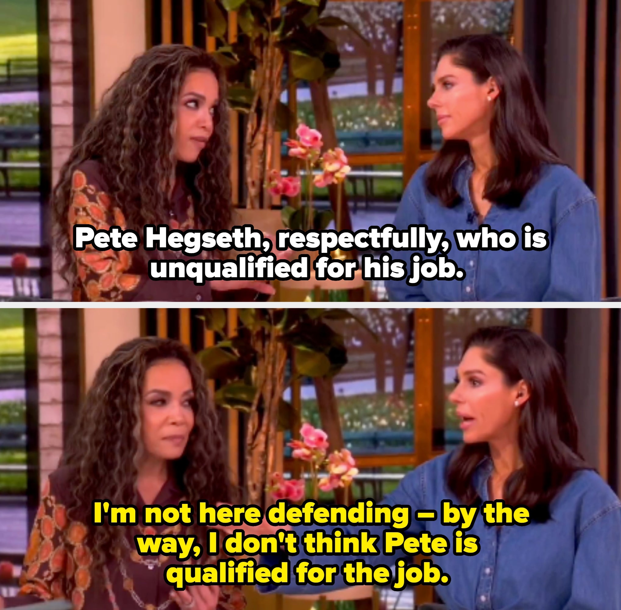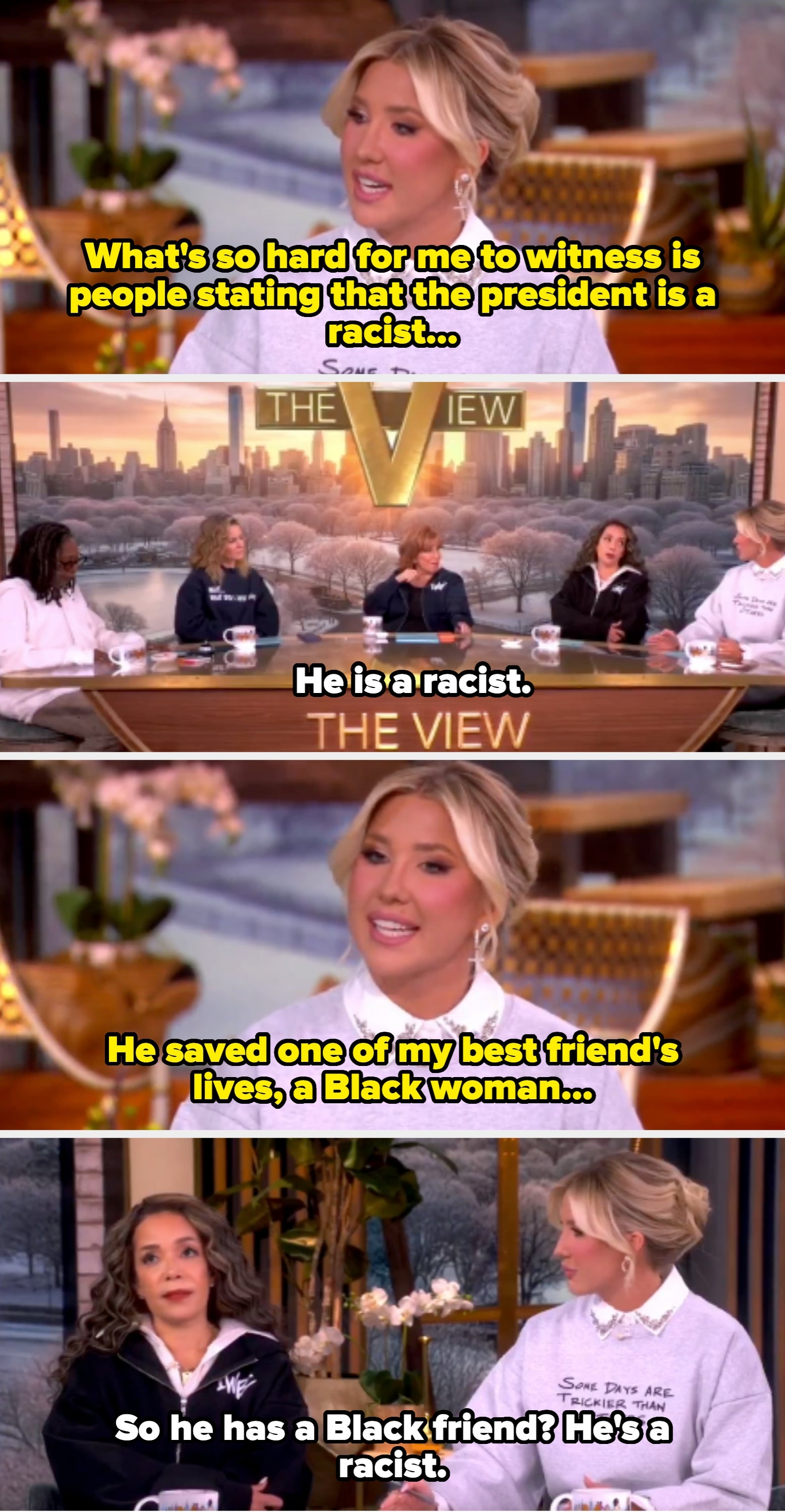 Ellen: How was the party? I wasn’t invited. Dakota: Actually, no, that’s not the truth Ellen. You were invited. Last time I was on the show, last year, you gave me a bunch of shit about not inviting you, but I didn’t know you wanted to be invited. Ellen: Well who doesn’t want to be invited to a party? Dakota: Well I didn’t even know you liked me. Ellen: Of course I like you. You knew I liked you… Dakota: But I did invite you and you didn’t come. Ellen: This time you invited me? Are you sure? Ellen: How do you know? I don’t think so. Dakota: Ask everybody. Ask Jonathan, your producer… Dakota: Aren’t you supposed to let people talk on this show? Jimmy: If I had your email or your phone number I would have called you a gazillion times... Rami: You have my email and phone number. Jimmy: That’s true, but I decided to not call you. Martin: This is the greatest show on television because there is no host in late night that pretends to care the way you do. Martin: I mean, no on captures phoniness the way you do. It’s a gift... Martin, later: I think it's so brave of you, five years in, to decide suddenly to abandon the comedy format. It's shaking her up. Steve: Actually, Marty and I learned from your show. We were backstage watching the monologue and we realized, wow, he must put the laughs in later. Abby: He's a smart guy, and he's a perfect Fox News host. Sunny: Is he a perfect Secretary of Defense? Abby: For one, I would say the memes, the cartoons and the moving memes, have got to stop. It’s really — there are people that are dying. That are losing their lives. Sunny: Do you think he's qualified to be the Secretary of Defense? Abby: I don’t hope for the demise of this country or the people who are in charge right now, so I pray for the best. I am very concerned because the way they are playing this game — Sunny: But do you think he's qualified to be the Secretary of Defense? Abby: — the way they are playing this game right now is like checkers. When the rest of the world is playing chess… Sunny: It sounds like you don't think he's qualified to be the Secretary of Defense. Abby: You know what, I’m very concerned… Sunny: So are you saying that Pete Hegseth is not qualified? Sunny: Pete Hegseth, respectfully who is unqualified for his job. Abby: I'm not here defending – by the way, I don't think Pete is qualified for the job. Savannah: What's so hard for me to witness is people stating that the president is a racist because I’ve seen them firsthand — Savannah: — one of my best friend's lives, a Black woman who has been with him for 18 years. Sunny: So he has a Black friend? He's a racist. Whoopi: Here’s the problem, Savannah, and why we have a different take on it, many of us have a different take on it. Because when you target DEI programs with executive office — with executive orders — your first week in office, arguing that the policies undermine national unity, you know, when you shared racist posts about the Obamas, when you pursued the death penalty for the Exonerated Five — after you knew they had been exonerated — these are the reasons his behavior is so hard and I don’t know whether you know about this, but in the ‘70s he was accused of discriminating against Black tenants because he wouldn’t rent to them. Whoopi: No, that was a proven fact. They took him to court. Kelly: If you kick every Latino out of this country, then who is going to be cleaning your toilet, Donald Trump? Rosie: Oh, that’s not…Latinos are not the only people doing that. Kelly: No, I didn’t mean it like that, come on. I would never mean it like that. Jimmy: The last time you were here, I don’t know if you remember, it was right after you’d opened your big studio in Atlanta. Tyler: Yeah, that you didn’t come to, the big party I had… I remember, I’m still scarred from it. You said you would send me a gift and I still don’t have the gift… Jimmy: I apologize for that, I don’t know what I was doing… oh, COVID, I think COVID was happening. Jimmy: I figured it must have been intended for Jimmy Fallon or something… why would I be invited to your party? Tyler: Well, it said Jimmy Kimmel and I did a special video to you, saying please come, so I don’t know how you could have gotten that mistaken. Tyler: And now you’re remembering why you haven’t invited me back since then. David: How many times have you been in rehab? David: How will this time be different? What are they rehabbing, first of all? What is on their list… Lindsay: We didn’t discuss this in the pre-interview, just saying… David: Is it alcohol? Do you drink too much? Lindsay: We’ve discussed this in the past… Lindsay: We’re here for a movie…let’s stay on the positive. Come on now… Cher, later: I thought that I would never want to do this show with you. David: Now, why? Let’s explore this a little. Why? Because you thought I was a — David: …I knew you probably felt that way. Cher: Because I told the guy on your show. Madonna: Incidentally, you are a sick fuck. I don’t know why I get so much shit. David later, asking a question: ...Is that an untrue rumor? Madonna: Isn’t that an oxymoron, an untrue rumor? Madonna: "Untrue rumor." That’s like "funny David Letterman." Madonna, later: Money’s made you soft… you just kiss up to everybody on your show now. Madonna, later: You do irritate me sometimes… you are always fucking with me on the show. David: ...There's something wrong with her. She can't be stopped. Madonna: There's definitely something wrong with me. I'm sitting here. Katie: Your private parts are different now aren’t they? Carmen: I don’t want to talk about it because it’s really personal. I’d rather talk about my modeling stuff…there’s more to trans people [than their genitals]. She went on: "There’s a young woman named Islan Nettles who on August 17 was just walking down the street with some friends, minding her ow