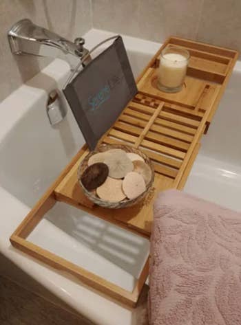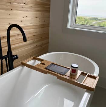 Promising review: "I love this bathroom caddy so much! Makes the bathroom feel like my own little spa, and it is great for holding my book, wine, and whatever else all right there. Such a great piece!" —Natalie