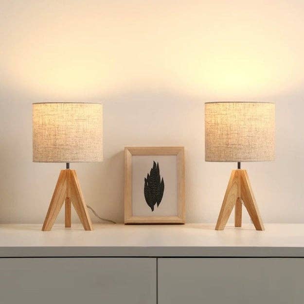 Promising review: "These lamps are so cute and perfect for my space and style. For now, I have one nightstand, so one is in the room, and one is in the living room. Doesn’t come with any lightbulbs whatsoever, so that's a downer on that. And the shade is a cardboard poster-like material, but pretty sturdy. I put some Philips Hue lights to control the ambiance, and it’s been great so far!" —Alicia