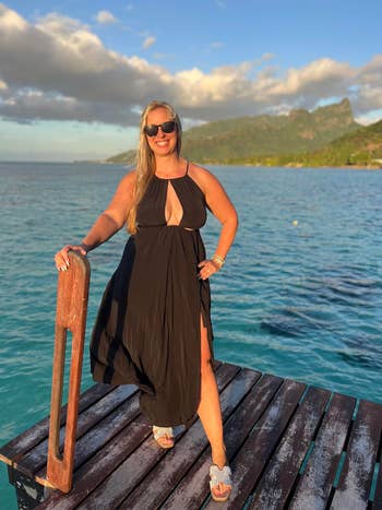 Promising review: "I’m 5'2" and currently 33 weeks pregnant. I’m normally a small and I ordered a small. The dress was snug, but is a stretchy material so it stretched well to fit the bump. I got a lot of compliments on it when I wore it to lunch and from others on social media. I’m short and wore flats so you’ll see it did not really go all the way down to the floor. It has adjustable straps and the material is like a thick sweater stretch material." —Jessica