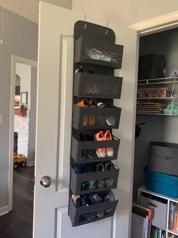 Promising review: "I am so happy I found this little gem of a product. I got one for myself and one for a friend who I was helping get organized. The little pockets are great and hold more than you think they will. I love that the front of the pockets is a clear view, so you can see everything that is in the pocket. The product is very sturdy and really super easy to put together and hang up on the doors." —MM1986