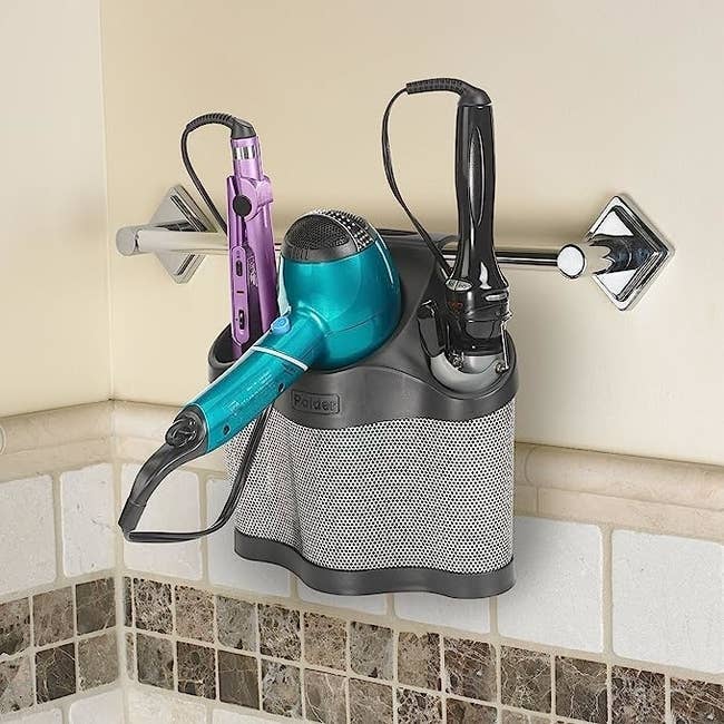 Promising review: "I have a ridiculously small bathroom and a super small vanity. After too many instances of my dryer and straightener falling to the floor, I went searching for an option to get them off the non-existent counter and onto the towel holder next to my sink. This product has done the trick — it helps me keep my counter space organized and provides me with a great, heat-resistant holder to place them in while I'm working through my hair. Highly recommend!" —Amazon Customer