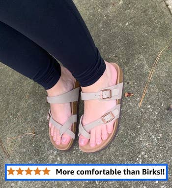 Promising review: "As someone who owns several pairs of Birks, these sandals are absolutely up to the expectations of real Birks! The Birks I have are the Arizona soft footbed. I wanted this style of Birks, but I couldn’t find the soft footbed version of them. I saw these and thought I might as well try them for the price. Let me tell you, these are even comfier than my soft-footbed Arizona Birks! Omg, they feel amazing. They are nice and padded! They are so adorable, too! Great quality." —Lee