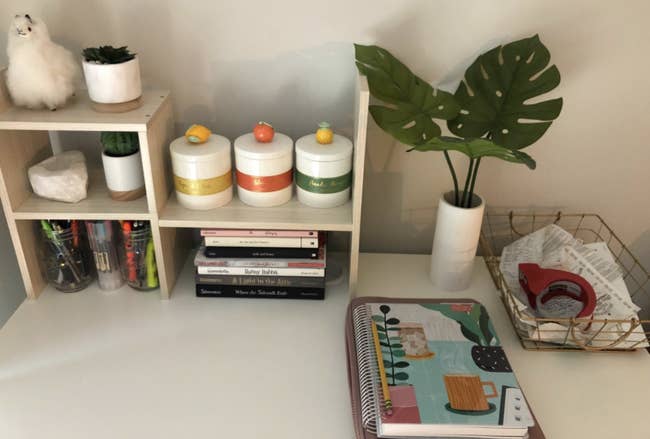 Promising review: "I got this to put on my desk in my dorm to provide more storage and I was blown away by the quality. It held all my notebooks and textbooks no problem. I've had a full-sized fern in a terra-cotta pot on it and it hasn't bellowed or buckled. It has many different slots so I could keep all my sticky notes, note cards, paper clips, etc. in arm's reach. It was very easy to assemble and even came with the screwdriver to put it together. I highly recommend it especially if you're a college student or work at a desk frequently." —Breanna Jones