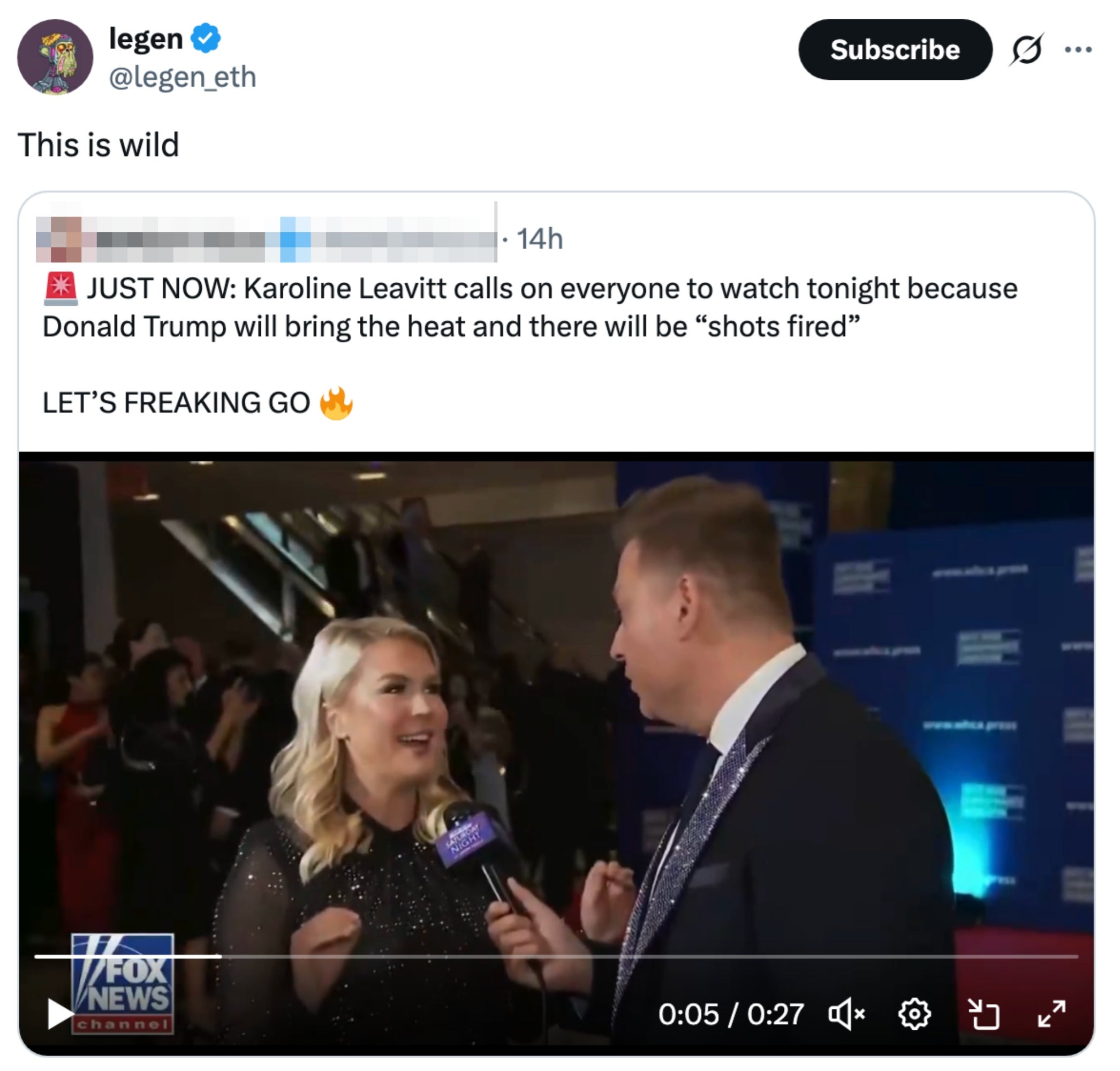 Karoline Leavitt to Fox before the WHCD event: There will be some shots fired tonight pic.twitter.com/vcVfZxYoat
