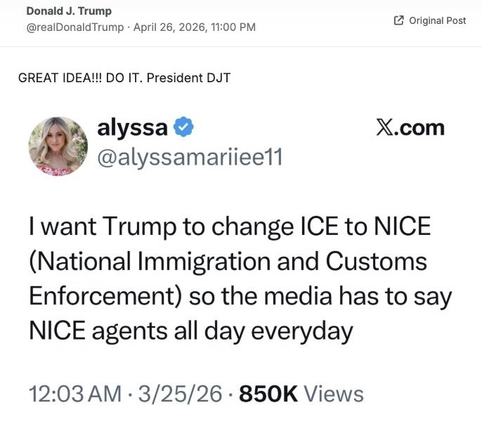 President Donald Trump on Sunday night posted a potential name change to a key federal agency ― seemingly for the sole purpose of trolling the media. Just one day after surviving another assassination attempt, Trump shared a post from a supporter urging him to change the name of U.S. Immigration & Customs Enforcement to National Immigration & Customs Enforcement. That would change the acronym from ICE to NICE, “so the media has to say NICE agents all day everyday,” the supporter wrote. “GREAT IDEA!!!” Trump wrote. “DO IT.” Versions of this proposal have been circulating as memes among Trump supporters for some time now, especially as the president faced criticism for the aggressive tactics used by ICE officers in immigration crackdowns. That’s led to protests against ICE and other federal agencies. During protests in Minneapolis earlier this year, federal agents shot and killed two U.S. citizens: Renee Good and Alex Pretti. Critics said a new name won’t change what they’ve done ― and likely won’t change how most people refer to the agency: It’s so dystopian https://t.co/6FjMBJrcYS Trump is awake and he’s now demanding that ICE be renamed to NICE so the media has to say “NICE agents” everyday. This is what the president is focused on. Very weird stuff. pic.twitter.com/5zOuYTMCaA Just like how I always call it Twitter, I will continue to call them ICE. https://t.co/2LKUkoBVEK President Trump playing word games like a middle schooler.Meanwhile the whole immigration system is still completely broken.Actual problems? Nop, let’s focus on branding instead. pic.twitter.com/XmqKlzf7fR Wonder how that would lower my fuel prices. https://t.co/7gXEnaovAe Aye yi yi… https://t.co/vlGkOwDJQv It won’t help pic.twitter.com/69LuAlrjRi They will just say national ice. Its not that hard. https://t.co/xTzoi62jio By entering your email and clicking Sign Up, you're agreeing to let us send you customized marketing messages about us and our advertising partners. You are also agreeing to our Terms of Service and Privacy Policy.