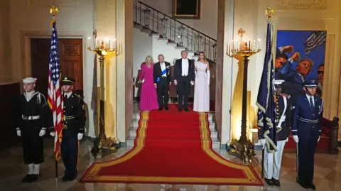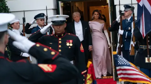 After walking through a guard of honour, a military band played both the US and UK national anthems.